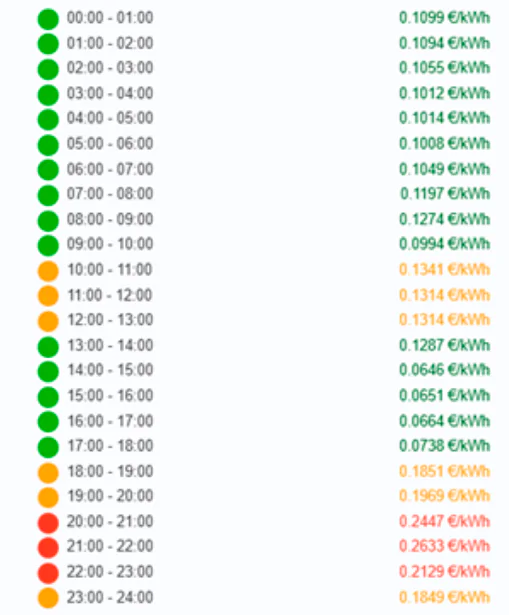En la siguiente imagen tienes una referencia del precio del kWh de luz por hora (día 30 de mayo de 2025)